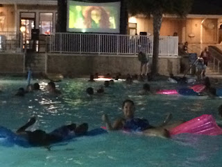 Here's something I had never done before...a dive-in movie. You float around in the pool while you watch a movie. I knit a little before getting in the pool.