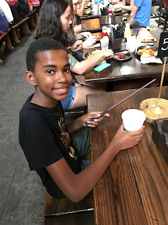 After he had wand in hand we headed to the Leaky Cauldron for lunch. We loved that you order and then the food is delivered to the table. The traditional English pub food was so yummy! Oh, and you don't have to find your own seat! AND...it was at the Leaky Cauldron that we had our first taste of BUTTERBEER! Little Man was definitely a fan!